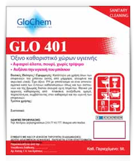 Το GLO 401 είναι ένα όξινο καθαριστικό αλάτων και βρωμιάς για όλο το χώρο του μπάνιου. Περιέχει ευχάριστο άρωμα φρεσκάδας.