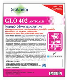 Το GLO 402 ANTIKALK είναι ισχυρό όξινο καθαριστικό που απομακρύνει τις εναποθέσεις αλάτων (ασβέστιο) από σκεύη και επιφάνειες.